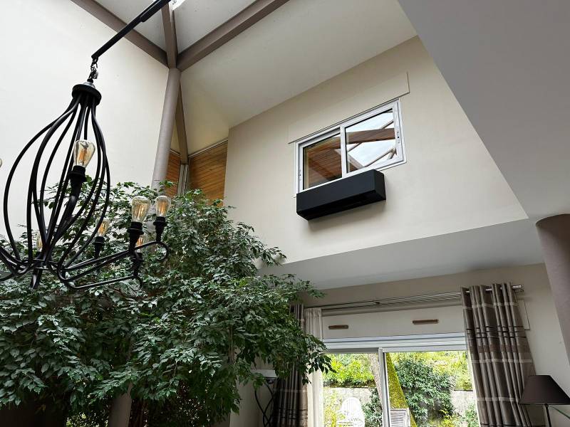 Le choix de l’unité intérieure en noir mat apporte une touche de modernité et d’élégance, parfaitement intégrée à la décoration existante. Ce type d’appareil s’adresse autant à ceux qui recherchent la discrétion qu’à ceux qui souhaitent faire de leur système de chauffage un élément décoratif à part entière.